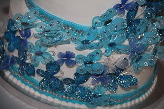 I didn't do the cake ok I am not crazy! But the ribbons around the cake I placed each crystal with tweasers. The butterflies were not handmade. They were ordered but I had to reshape almost all of them so I got my hand in that to. They swirl around the cake. Loved this cake!!! As you can kinda see below!