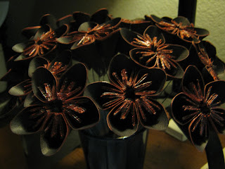 These I am making for a very special friend of mine that is one of the sweetest people I know. They will be intermixed with the red rose flowers below. This of course is just the begining. It is made from scrapbook paper that is red on one side and black on the other. so the edges are red and so is the center then I mixed glitter with Mod Podge and that way the litter won't come off but we get some sparkle to them.